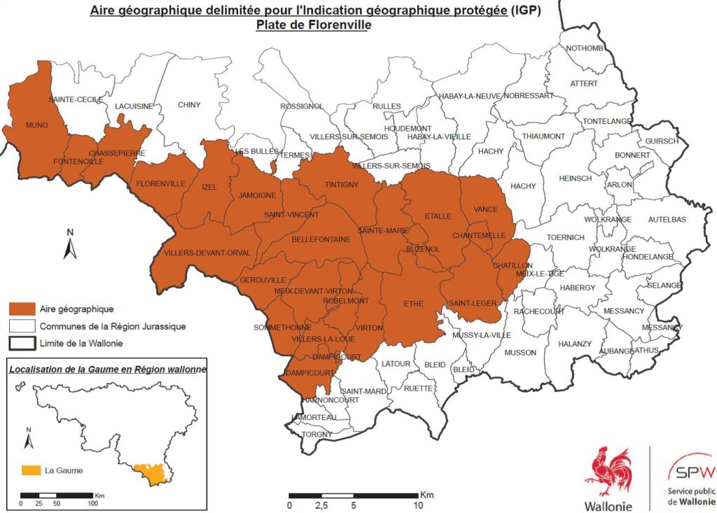 Pour sa nouvelle désignation IGP, l’aire géographique de production de la plate se compose de la commune de Florenville ainsi que des anciennes communes comprises dans le triangle « Muno-Vance-Châtillon-Dampicourt ». Les sols sablonneux de la Gaume apportent toutes les qualités requises au développement du tubercule. Ses régions sont bien spécifiées sur le rapport « Association pour l’Usage et la Défense de la Plate de Florenville : IGP et la Promotion de son Appellation (UDPF) a.s.b.l » dont la carte est reprise ci-dessous.